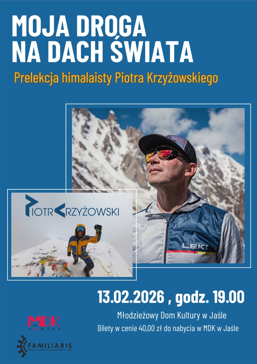 Serdecznie zapraszamy na spotkanie z Piotrem Krzyżowskim, himalaistą, ratownikiem GOPR oraz prawnikiem. Prelekcja odbędzie się 13 lutego 2026 r. o godz. 19.00 w Młodzieżowym Domu Kultury w Jaśle. Bilety w cenie 40,00 zł dostępne są na portiernii w MDK w Jaśle.