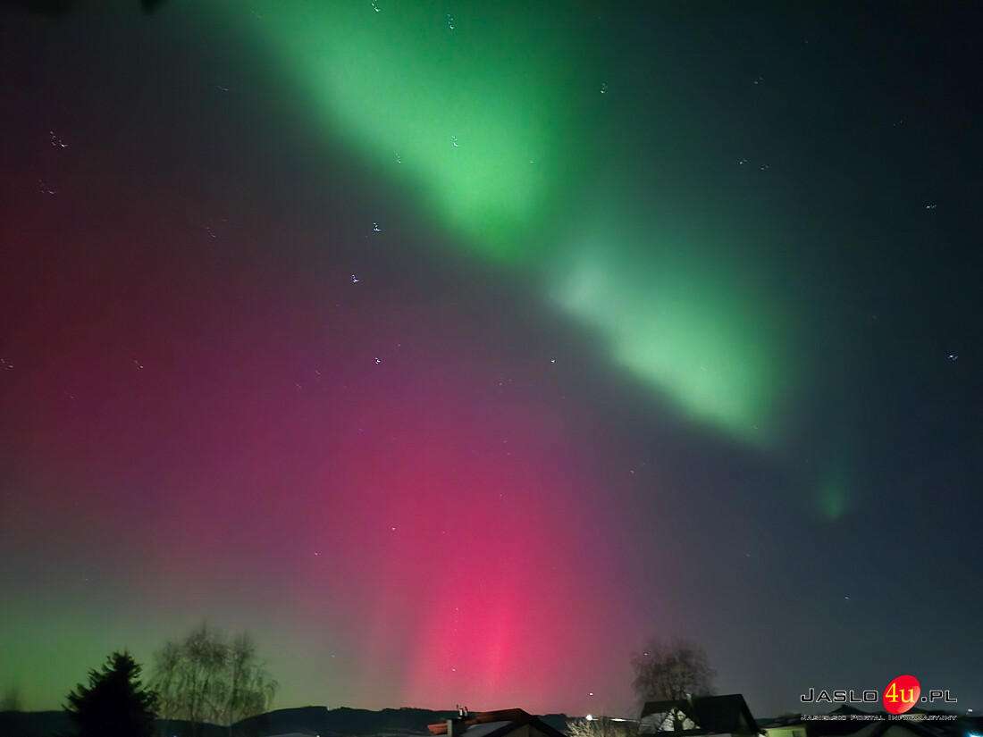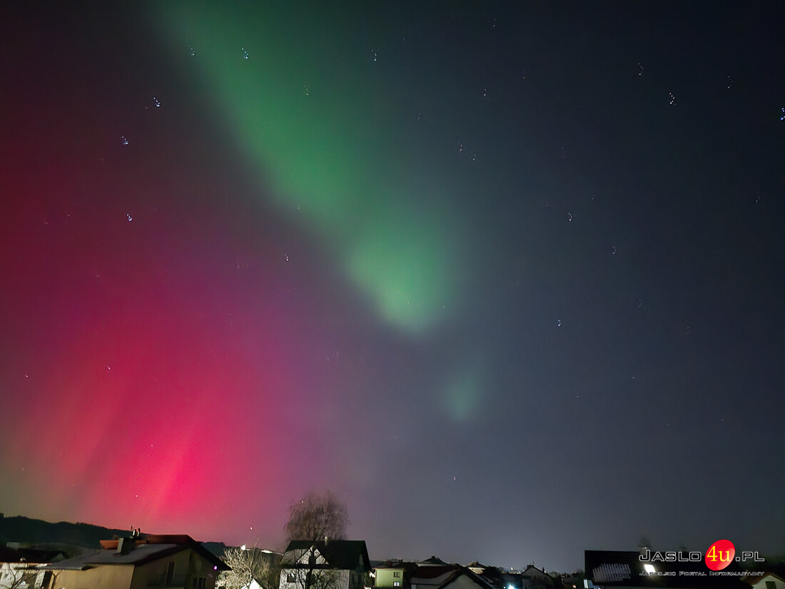 To jedna z tych nocy, które warto spędzić z głową uniesioną ku górze. Zorza polarna jest widoczna również nad Jasłem i — jak wskazują obserwatorzy — może być obserwowana przez całą noc. Zjawisko jest efektem silnej aktywności Słońca, która wywołała zaburzenia w ziemskim polu magnetycznym.
